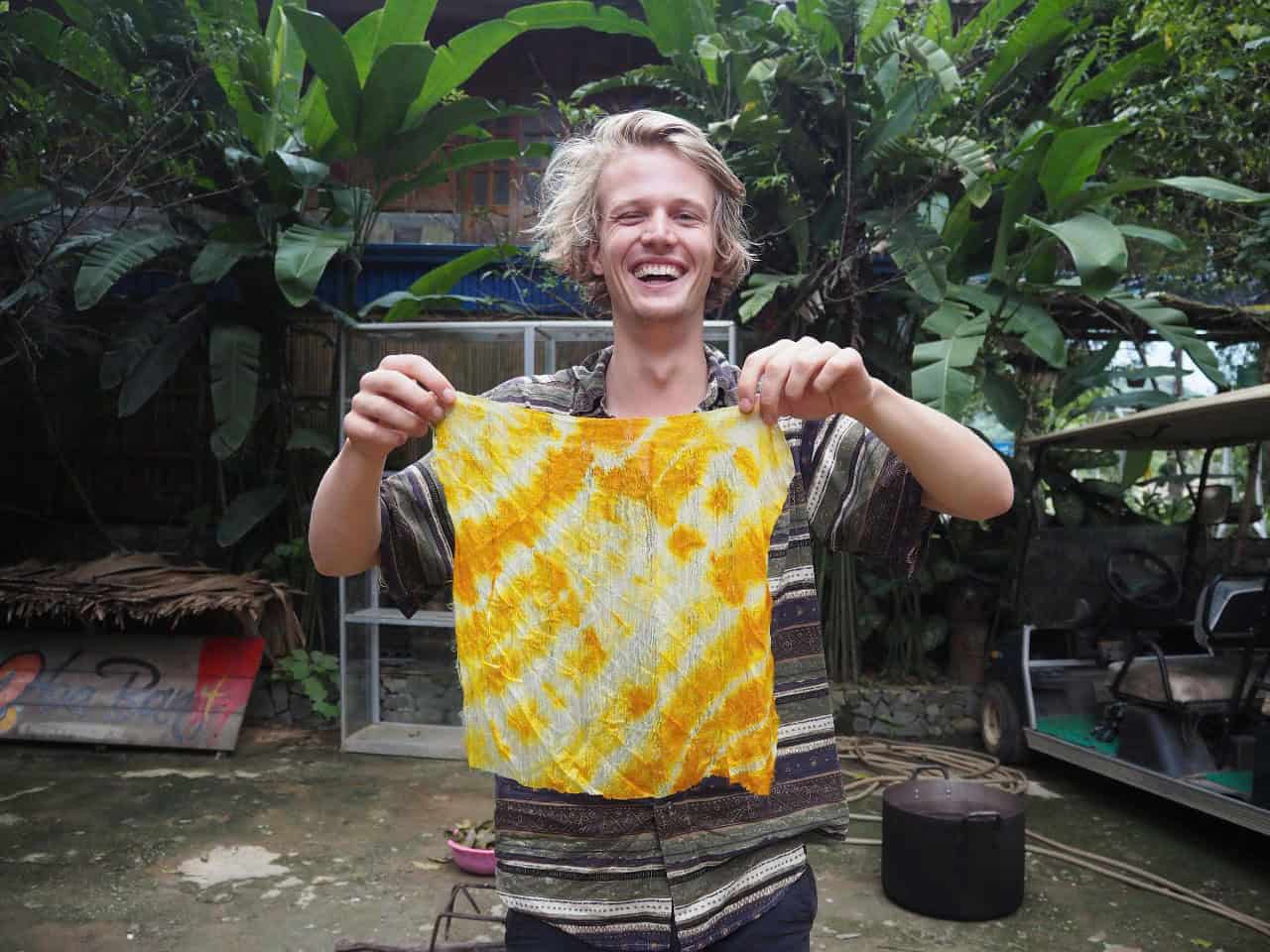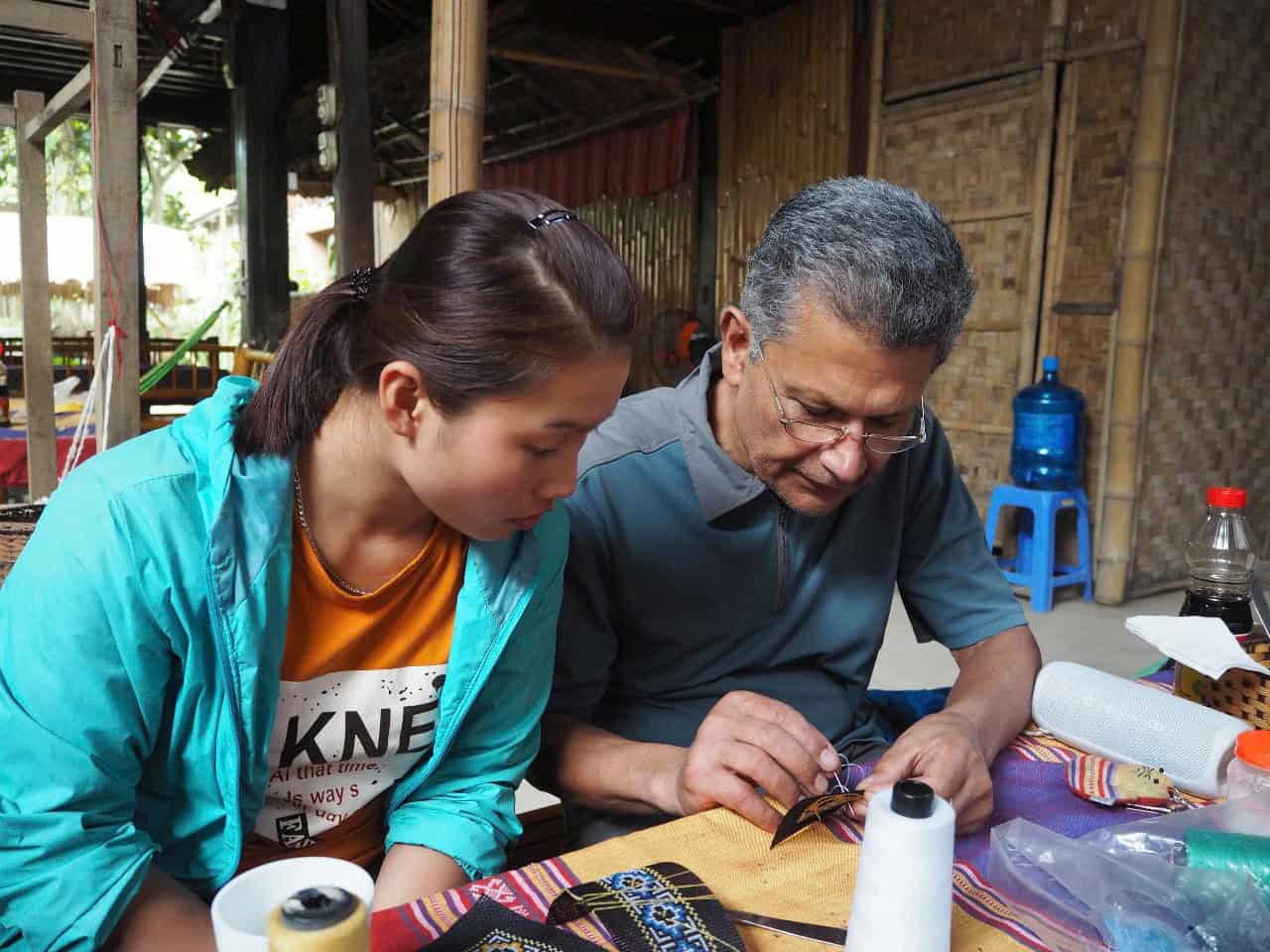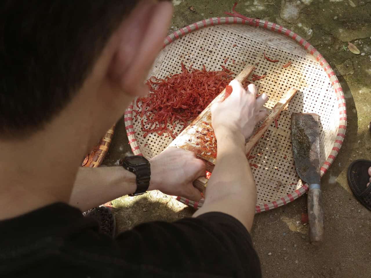 סדנה מסורתית להכנת צבעים טבעיים וצביעת בדים במאי צ'או. בישול חומרים מהטבע, קשירת הבד ליצירת דוגמאות וצביעה בשיטות עתיקות.