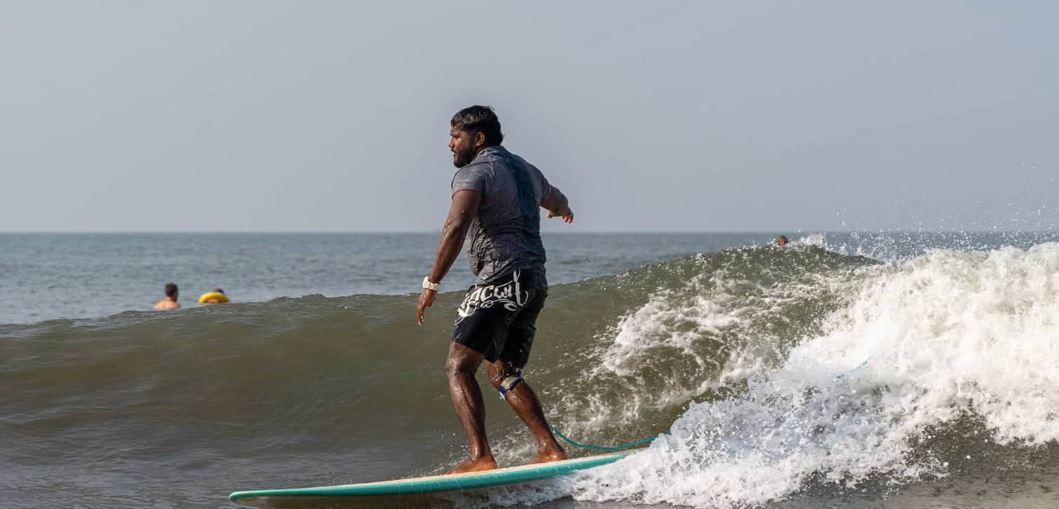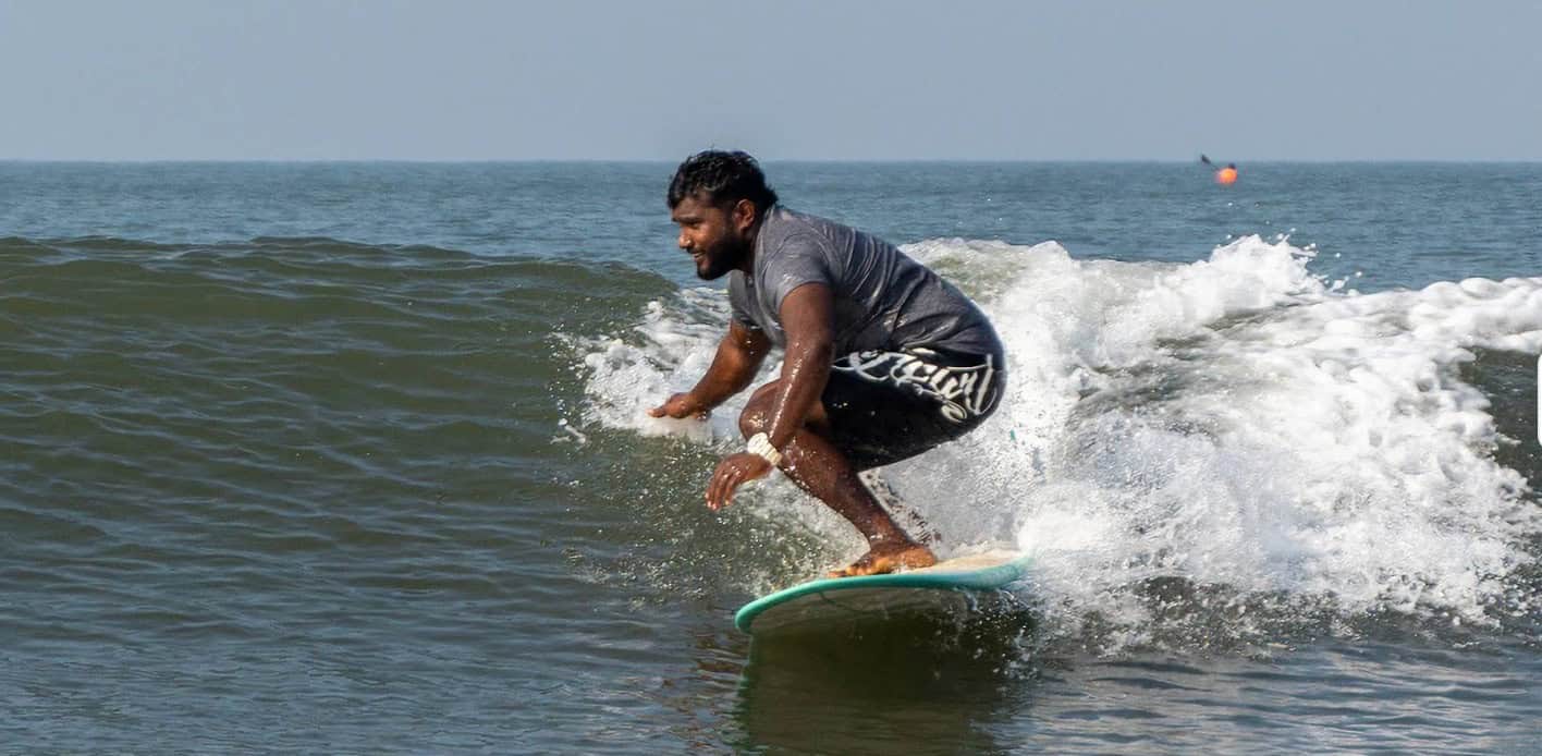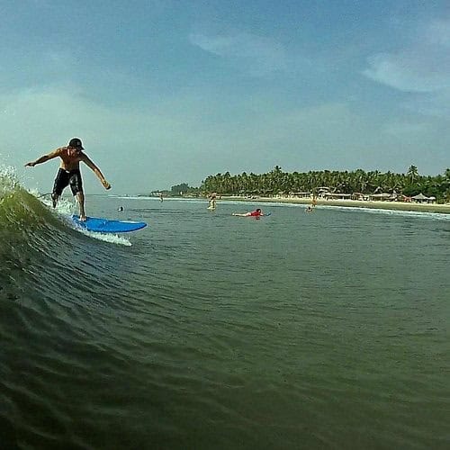 שיעור גלישה קבוצתי עם מדריכים מנוסים בחוף ארמבול, גואה. הדרכה מקצועית, ציוד מלא, אווירה כיפית וחוויה מושלמת לכל רמה.