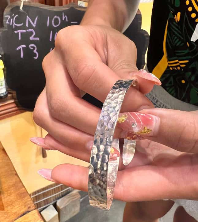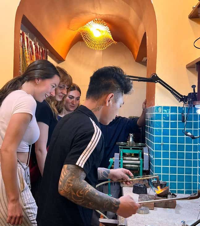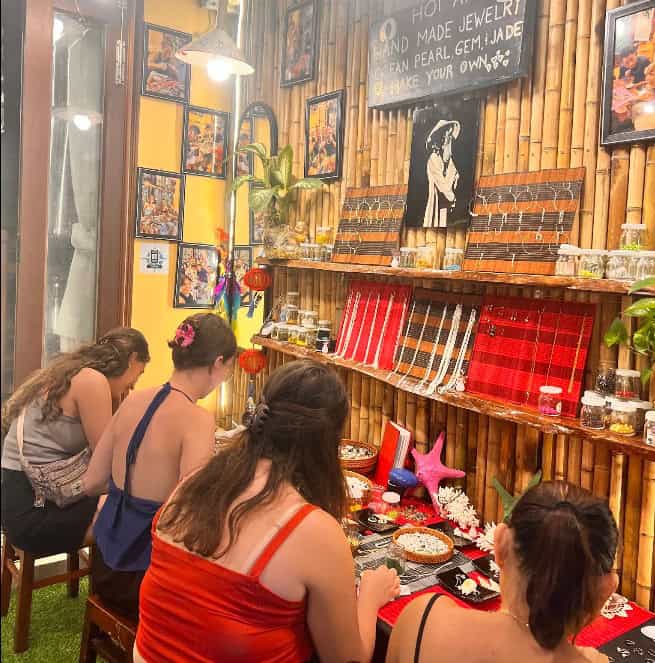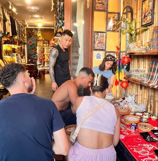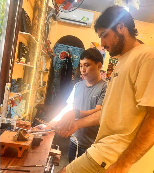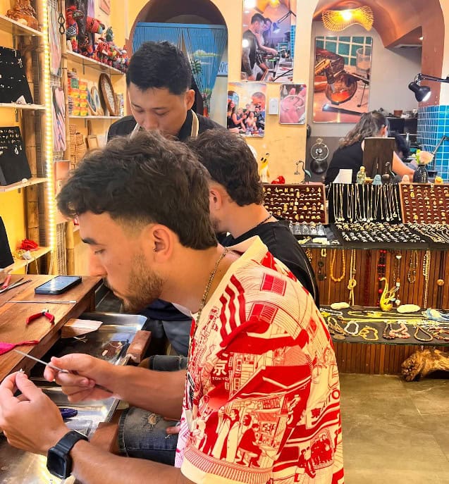 סדנת צורפות מקצועית בחנות של קים מאפשרת למטיילים ללמוד, ליצור ולייצר תכשיט כסף אישי בהנחיית צורף וייטנאמי, תוך שימוש בכלי עבודה אמיתיים ואיכותיים. הסדנה כוללת הסבר על טכניקות עיבוד כסף, תכנון הדגם הרצוי – טבעת, שרשרת או עגיל – ועבודה מעשית המקנה ידע בסיסי במקצוע. כל משתתף עובר את כל שלבי היצירה, כולל גימור וליטוש אישי, ויוצא עם תכשיט ייחודי כמזכרת. ההדרכה אישית, סבלנית, ומיועדת ליחידים, זוגות או קבוצות – אין צורך בניסיון קודם. הסדנה מתקיימת באווירה נעימה ופתוחה, עם היכרות לעולם הצורפות המקומי. בסיום, אפשר לסייר בחנות, להתרשם ממגוון עבודות ולרכוש תכשיטים מקוריים בעבודת יד.