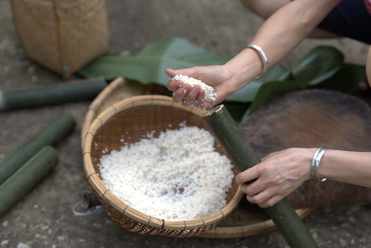 סדנה מסורתית להכנת אורז בצינור במבוק (Cơm Lam). בכפר מקומי במאי צ'או. חוויה אותנטית הכוללת טחינה, ניפוי, דפיקת אורז, צלייה ואכילה עם מלח שומשום ובוטנים.