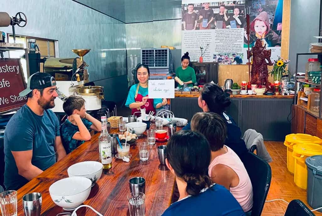 סדנת הקפה ב-SUA קפה בהוי אן היא אחת החוויות המפתיעות והמרגשות בעיר. לאורך כשעתיים, מדריכים מקומיים ילוו אתכם למסע מהפולים הירוקים, דרך הסבר קצר על היסטוריה של קפה וייטנאם – ועד הכנה עצמית של סוגי קפה אייקוניים: פין קפה, ביצה, קוקוס ומלוח. כל חומרי הגלם, הציוד והידע ניתנים באווירה קלילה, עם הרבה מדריכים, תמיכה, הומור וטעימות בכל שלב. הסדנה מסתיימת בטעימות קפה מגוונות, קבלת מתנה קטנה למשתתפים. היופי: SUA קפה הוא מיזם חברתי בו חלק מהרווחים מוקדשים לסיוע לבעלי מוגבלויות. גישה נגישה, סביבה טבעונית ולוקיישן פסטורלי עושים את הסדנה מושלמת לחובבי קפה, זוגות, קבוצות או יחידים.